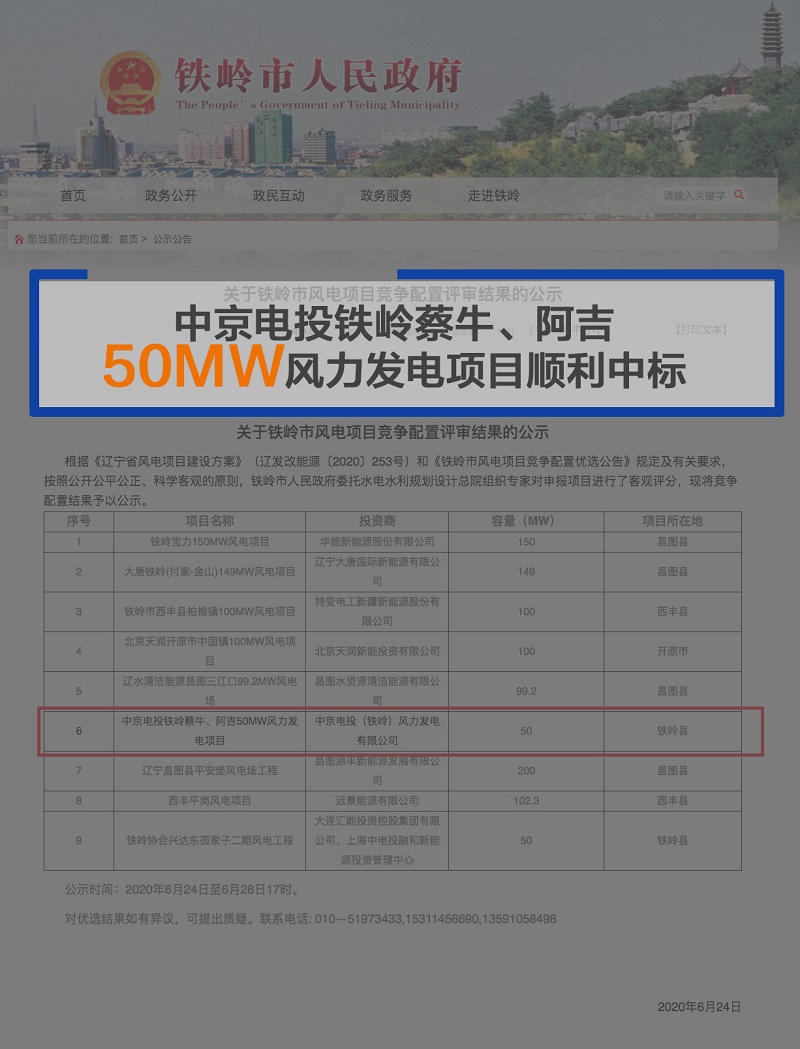 2020年06月24日 ,铁岭市人民政府发布公示,尊龙凯时铁岭蔡牛、阿吉50MW风力发电项目顺利中标。